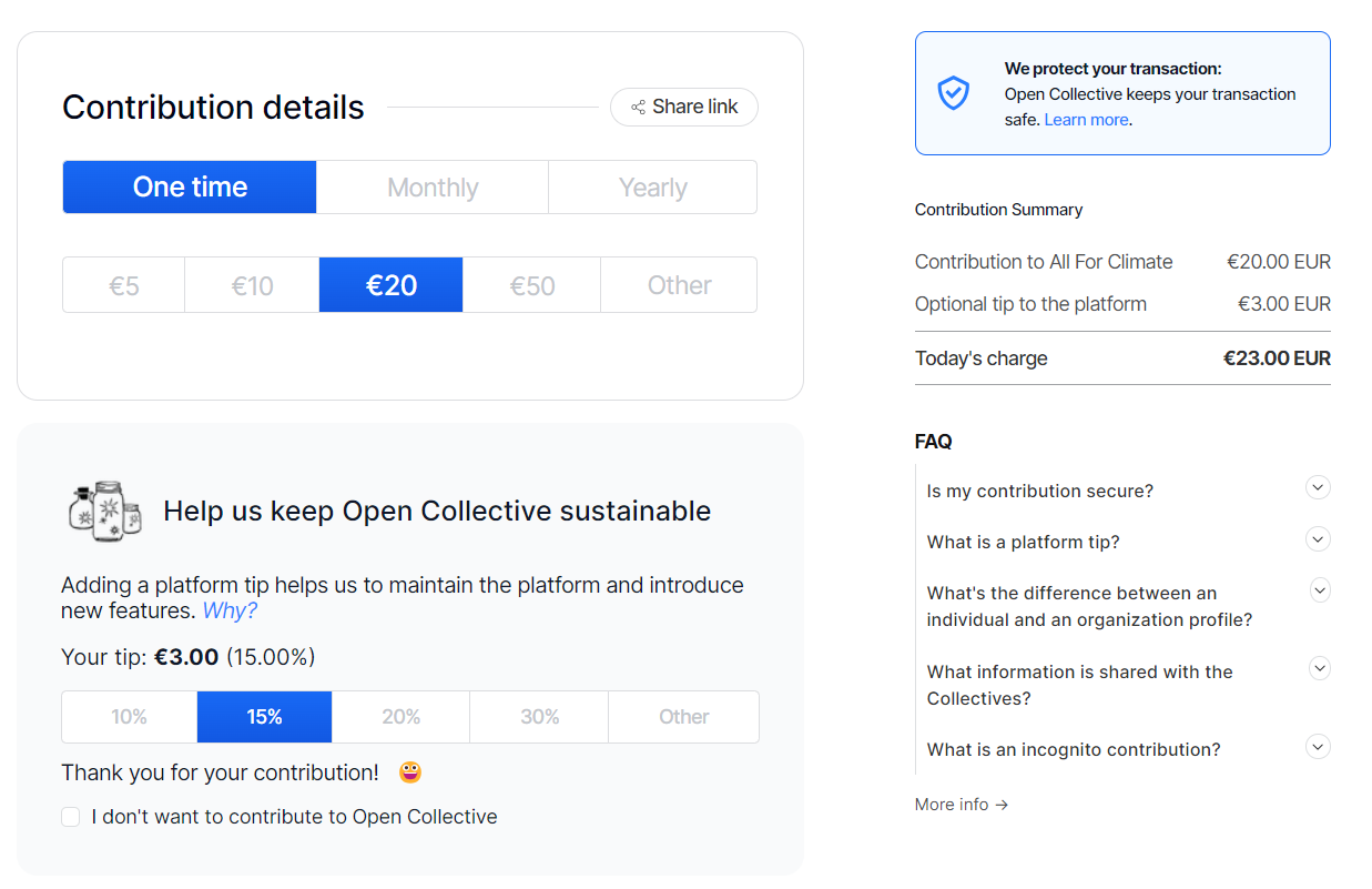 With every donation there is a default optional tip of 15% to the platform we use for our fiscal hosting activities. This platform is called Open Collective. You can find more info on [Open Collective here.](https://opencollective.com) Please note this tip is optional. To remove it, you have to select "edit" and "I don't want to contribute". We recommend informing your donors about this as well.